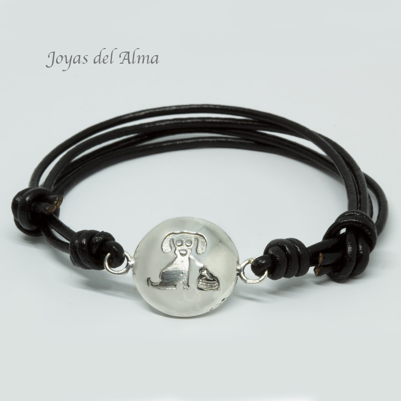Pulsera Plata de Ley y Cuero con perro(20x20 mm), 18-23 cm.