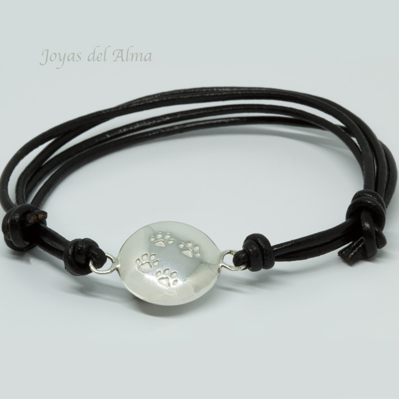 Pulsera Plata de Ley y Cuero con huellas(20x20 mm), 18-23 cm.